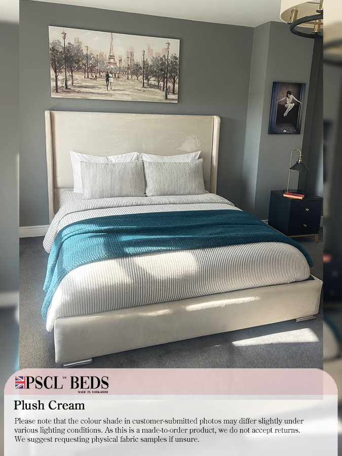 Additionally, the wingback bed frame boasts sophisticated chrome feet that add a touch of refinement to your space. The standard headboard height of 137cm is ideal for showcasing your choice of pillows and linens. The plush cream colour of the main display picture beautifully coordinates with various interior designs.